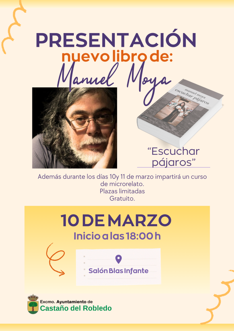 El martes día 10 de marzo, Manuel Moya nos presenta su nuevo libro "escuchar pájaros". Todo un honor contar con este gran escritor de nuestro pueblo vecino. Será en el salón Blas Infante a las 18,00h.